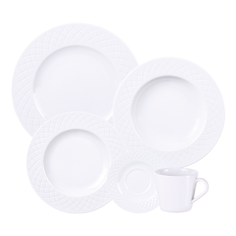 O aparelho de jantar ingrid tramontina possui 20 peças distribuídas para atender 4 pessoas. Cada lugar conta com prato raso de 27 cm, prato fundo de 23 cm, prato de sobremesa de 21 cm e xícara de chá com pires de 185 ml, garantindo praticidade e organização.