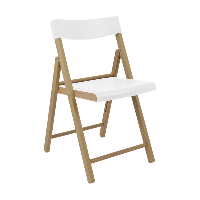Ela é produzida em madeira Tauari FSC com acabamento lixado e possui assento e encosto em polipropileno branco, garantindo resistência e leveza ao mesmo tempo.