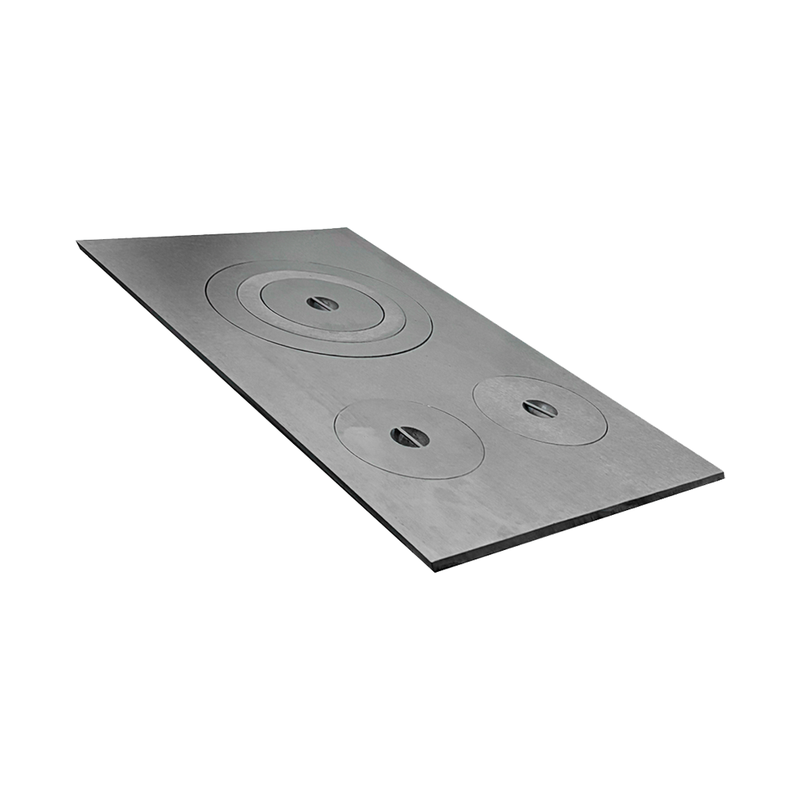 Fabricada em chapa polida ferro fundido de alta resistência, possui 40x60cm de superfície útil e espessura variável entre 1,0 e 1,8cm, característica do processo artesanal. Pesa aproximadamente 11,180kg, conferindo estabilidade estrutural. Conta com 3 furos: dois chapéus laterais, um central e duas argolas removíveis. Suporta temperaturas de até 1000 °C. A instalação é simples: apoie a tampa fogão a lenha apenas sobre a base, sem parafusos ou argamassa. No primeiro uso, aqueça com fogo brando. Para manter o espelhado, limpe morna com massa de polir e palha fina.