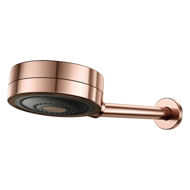 O chuveiro conta com tecnologia avançada, cabeça articulada para direcionar o jato, restritor de vazão de 12 L/min e design exclusivo em Cobre Polido.