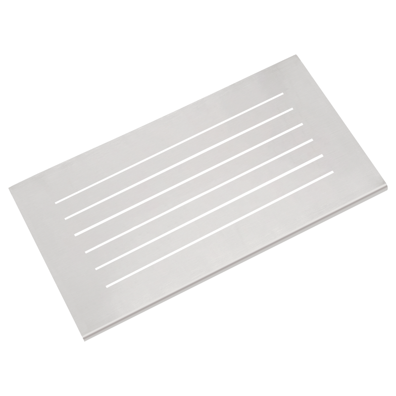 Feito em aço inox AISI 304, espessura 1 mm, com acabamento acetinado. Medidas: 299 x 162 x 9 mm (C x L x A), ideal para sobrepor no canal organizador.