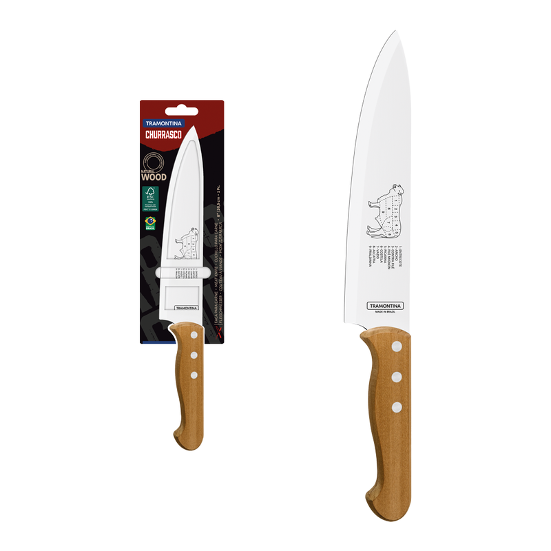 O cabo em madeira natural, fixado com rebites de alumínio, garante resistência, equilíbrio e um toque rústico sofisticado à mesa. Produzido com madeira proveniente de florestas bem manejadas, contribui para escolhas mais conscientes e sustentáveis. Para maior vida útil, recomenda-se lavagem manual e secagem imediata após o uso. Evite deixar a peça úmida ou exposta por longos períodos. Ideal para quem busca faca para carne inox 8 polegadas, resistente e elegante, esta peça é indispensável para churrasqueiros exigentes. Garanta agora a sua e transforme cada corte em um verdadeiro ritual de sabor e precisão.