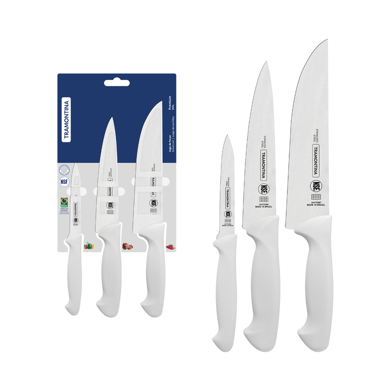 O Jogo de Facas Tramontina Premium com Lâminas em Aço Inox e Cabos de Polipropileno Branco 24499811 3 Peças é a escolha ideal para quem busca desempenho, segurança e elegância na cozinha. Com lâminas em aço inox que recebem tratamento térmico, oferecem fio de alta durabilidade e cortes precisos em carnes, legumes e frutas. O conjunto acompanha Faca Utility 6", Faca Cozinha 7" e Faca Legumes e Frutas 4", atendendo diferentes necessidades com eficiência. O design moderno aliado à qualidade reconhecida da Tramontina transmite autoridade e confiança — um investimento inteligente para quem valoriza resultados superiores no preparo das refeições.