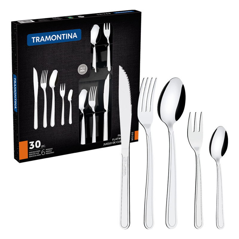 O faqueiro 30 peças Tramontina atende até 6 pessoas, sendo perfeito para famílias e pequenas reuniões.