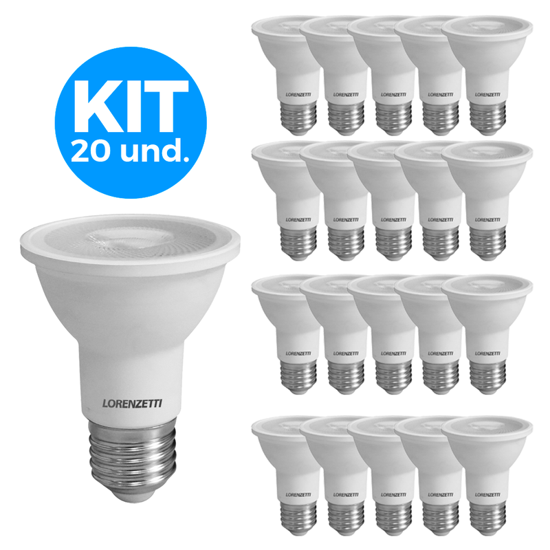 O kit inclui 20 lâmpadas LED Lorenzetti Par 20 7W, bivolt e com soquete E27, embaladas para garantir segurança no transporte e prontas para instalação em ambientes residenciais e comerciais.
