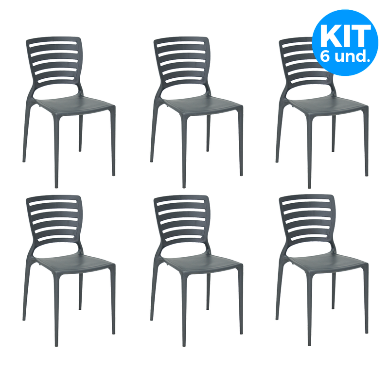 O Kit 6 Cadeiras Tramontina Sofia Grafite serve para proporcionar assentos confortáveis e seguros em sua casa ou escritório. Com design moderno e encosto vazado, permite ventilação e ergonomia, sendo ideal para refeições, reuniões e eventos. O formato empilhável facilita armazenamento e transporte, garantindo funcionalidade, durabilidade e elegância nos ambientes.