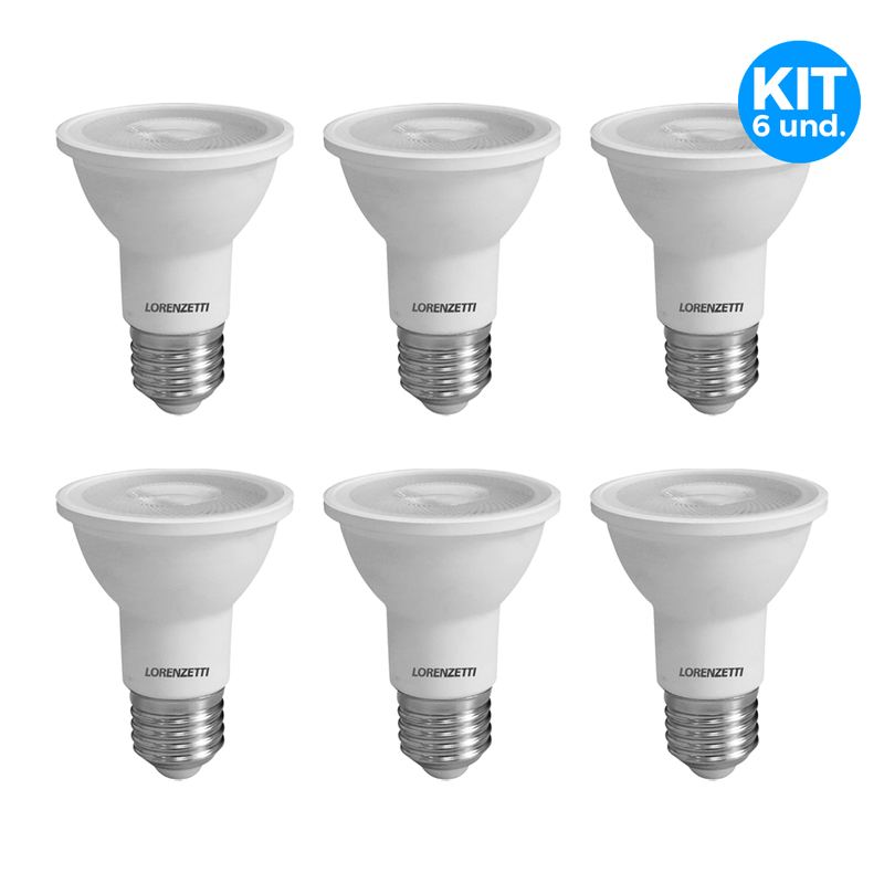O kit inclui 6 lâmpadas LED Lorenzetti Par 20 7W Bivolt E27, embaladas individualmente para maior segurança e prontas para instalação imediata.