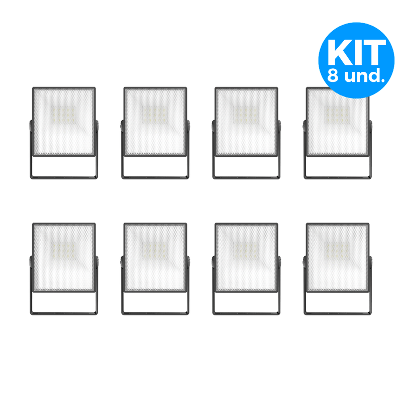 O kit inclui 8 Refletores Lorenzetti LorenLED 10W Stilo na cor preta, bivolt e luz 6500K (branco frio), todos prontos para instalação.