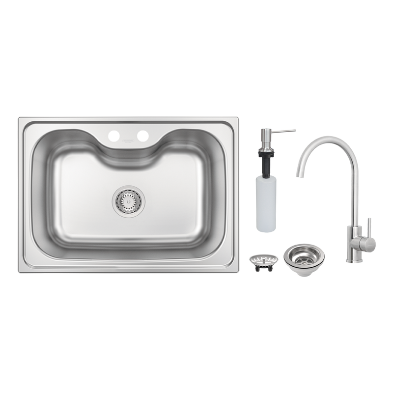 O kit é completo e acompanha 1 cuba tramontina morgana 60 fx, 1 kit de fixação, 1 válvula original de 4 1/2", 1 dosador de sabão de 500 ml em aço inox, 1 misturador monocomando tramontina em aço inox e manual de instalação, garantindo compatibilidade total entre os componentes.