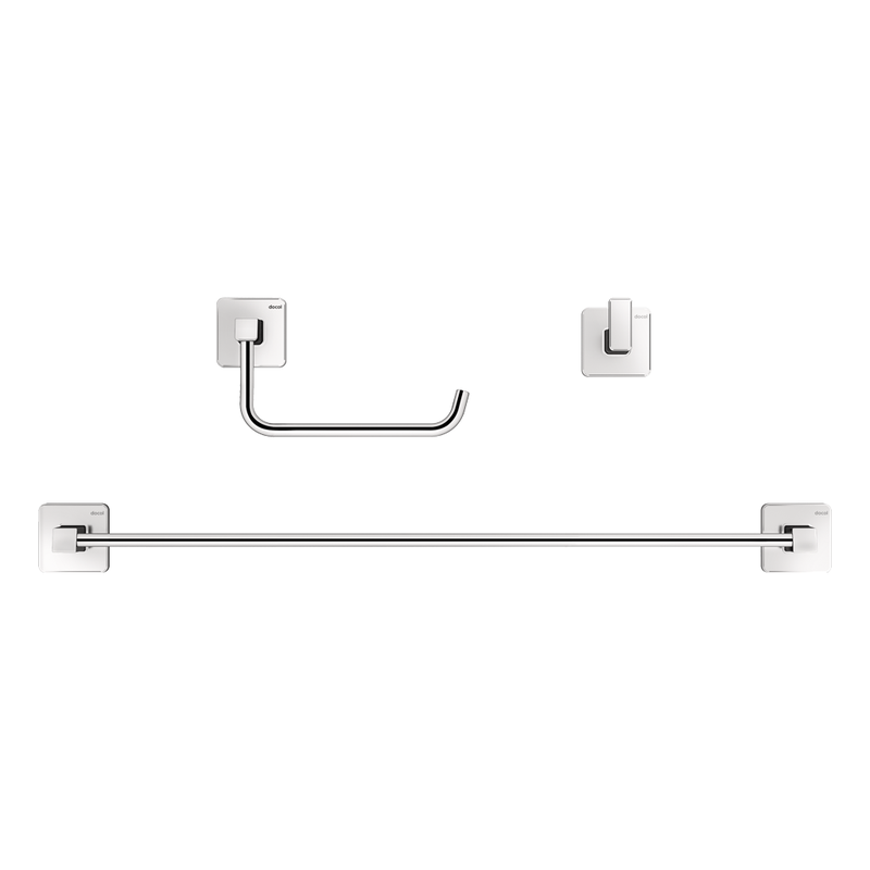 O kit é composto por cabide, papeleira e porta-toalhas bastão, as três peças mais utilizadas em banheiros modernos. Tudo isso em uma embalagem exclusiva padrão Docol.
