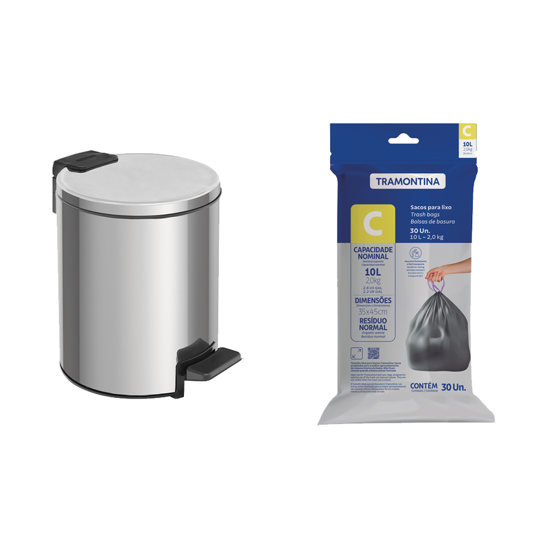 Com este kit, você tem a combinação ideal entre funcionalidade, durabilidade e praticidade, tudo com a qualidade consagrada da Tramontina. A lixeira suporta até 1 milhão de ciclos de abertura e conta com base antiderrapante e balde plástico removível para facilitar a troca. Os sacos de até 10 litros oferecem alças resistentes e fechamento seguro, sendo produzidos em plástico 100% reciclável. Apesar da capacidade maior, adaptam-se perfeitamente ao uso em lixeiras de 3 litros, garantindo eficiência e praticidade para o seu espaço.