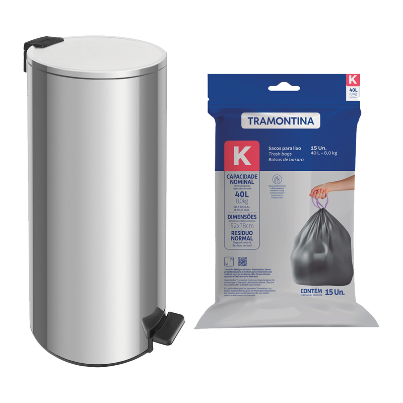 Para complementar, o kit inclui o Saco Plástico de Lixo Tramontina 40 Litros (K) | 8,0Kg, desenvolvido especialmente para garantir vedação segura contra odores e encaixe perfeito em lixeiras Tramontina. Fabricado em plástico 100% reciclável e de alta resistência, ele oferece praticidade no descarte, além de alças reforçadas que facilitam o fechamento e o transporte. Essa combinação exclusiva une qualidade, sustentabilidade e eficiência, proporcionando mais organização e higiene para o dia a dia, com a confiança e excelência da marca Tramontina.
